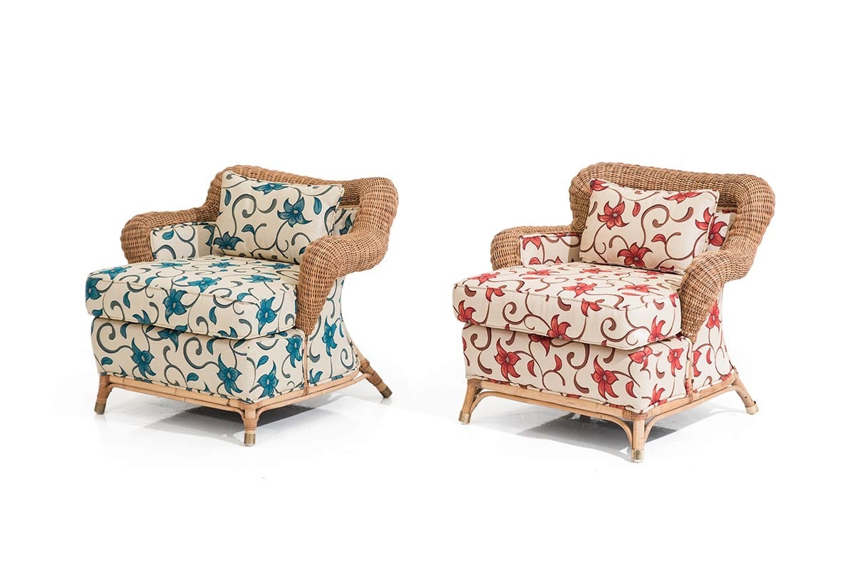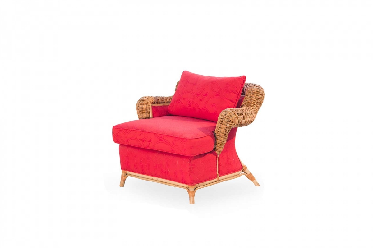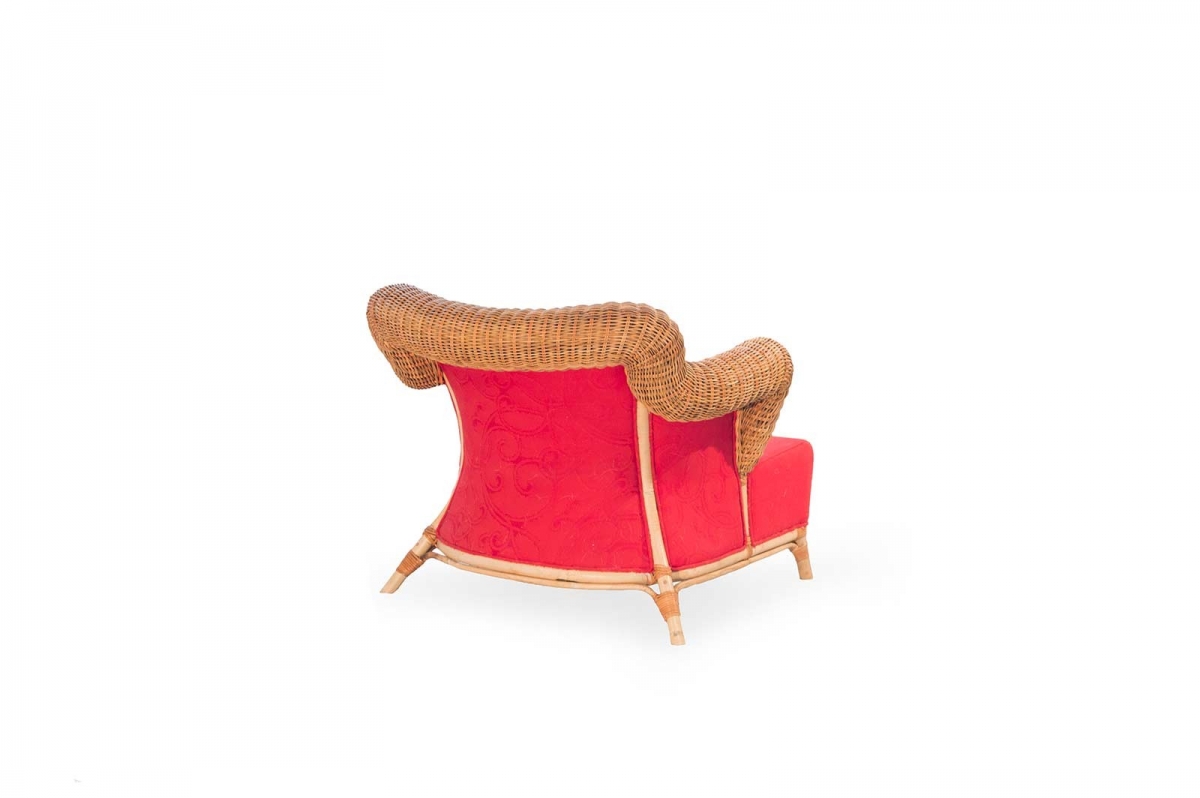 La poltrona Tosca ha il telaio in rattan, intrecciato in midollino o giunchino da 3mm. Finitura trasparente opaca.